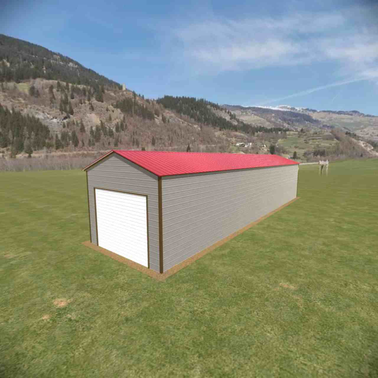 The 12×50 vertical roof metal garage comes standard with 9′ legs fully enclosed. The cost of the garage door, walk in door or window is not included in the price.
