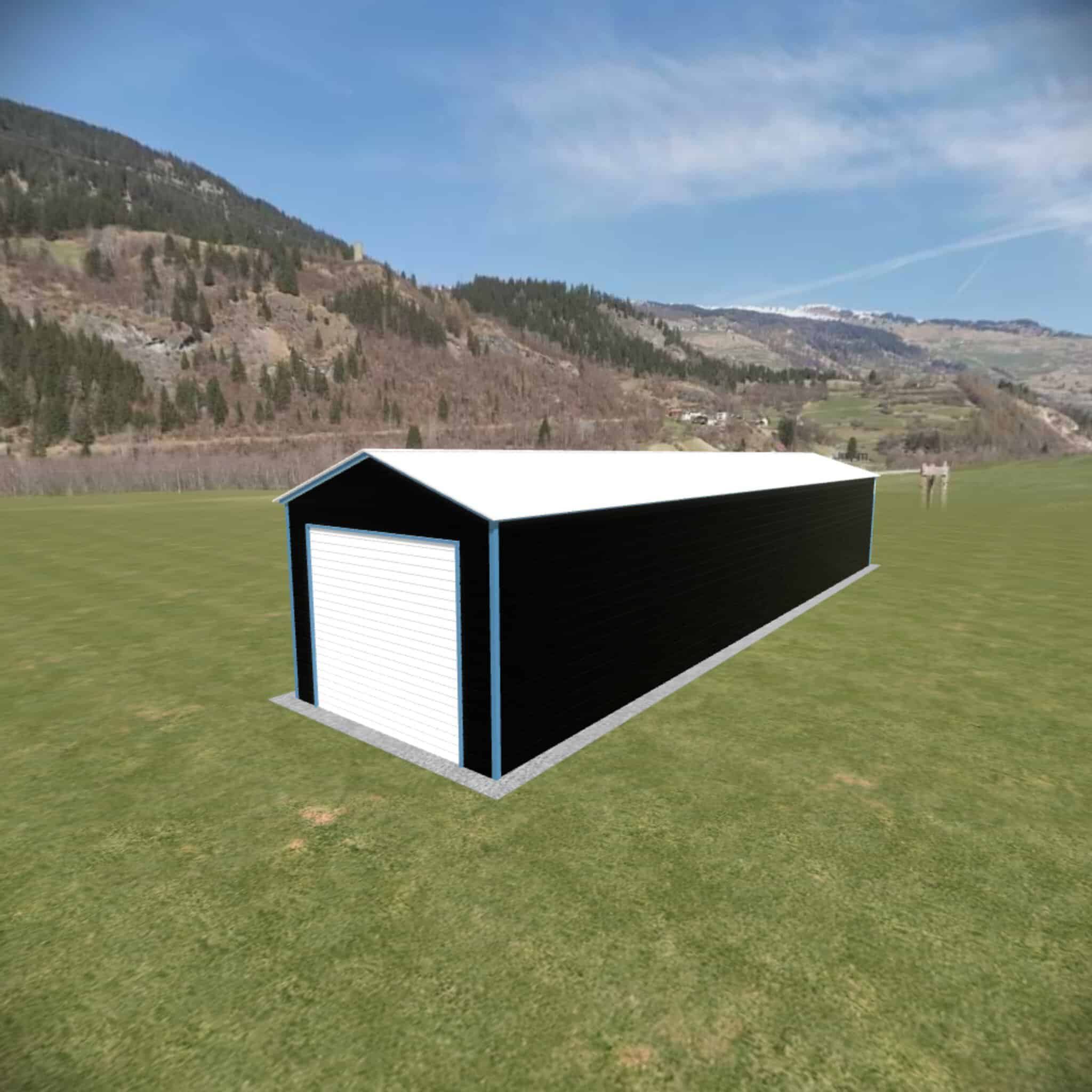 The 12×55 vertical style metal garage comes standard with 9′ legs fully enclosed. The cost of the garage door, walk in door or window is not included in the price.