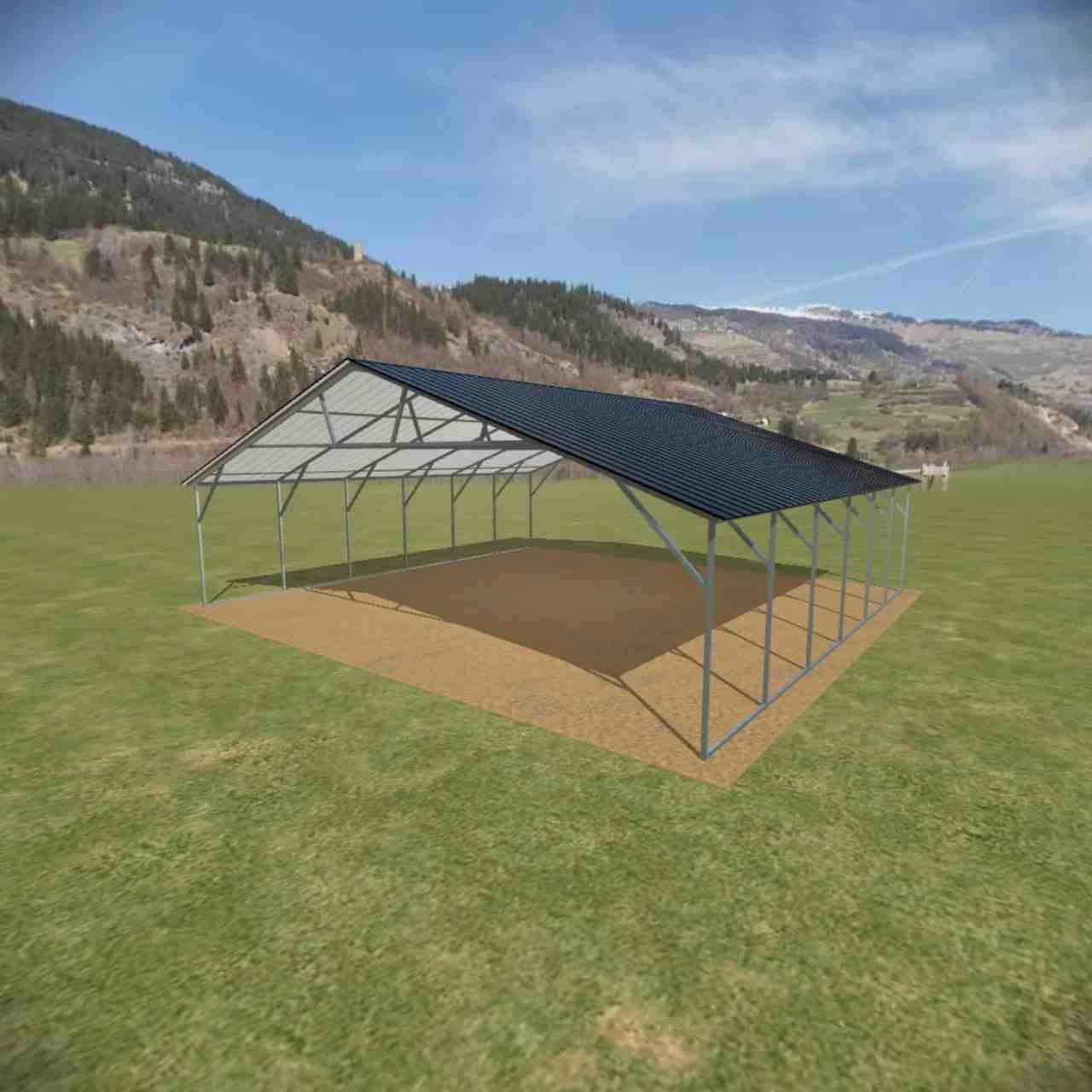 This vertical steel carport is shown with options of panel on both sides and two gables.