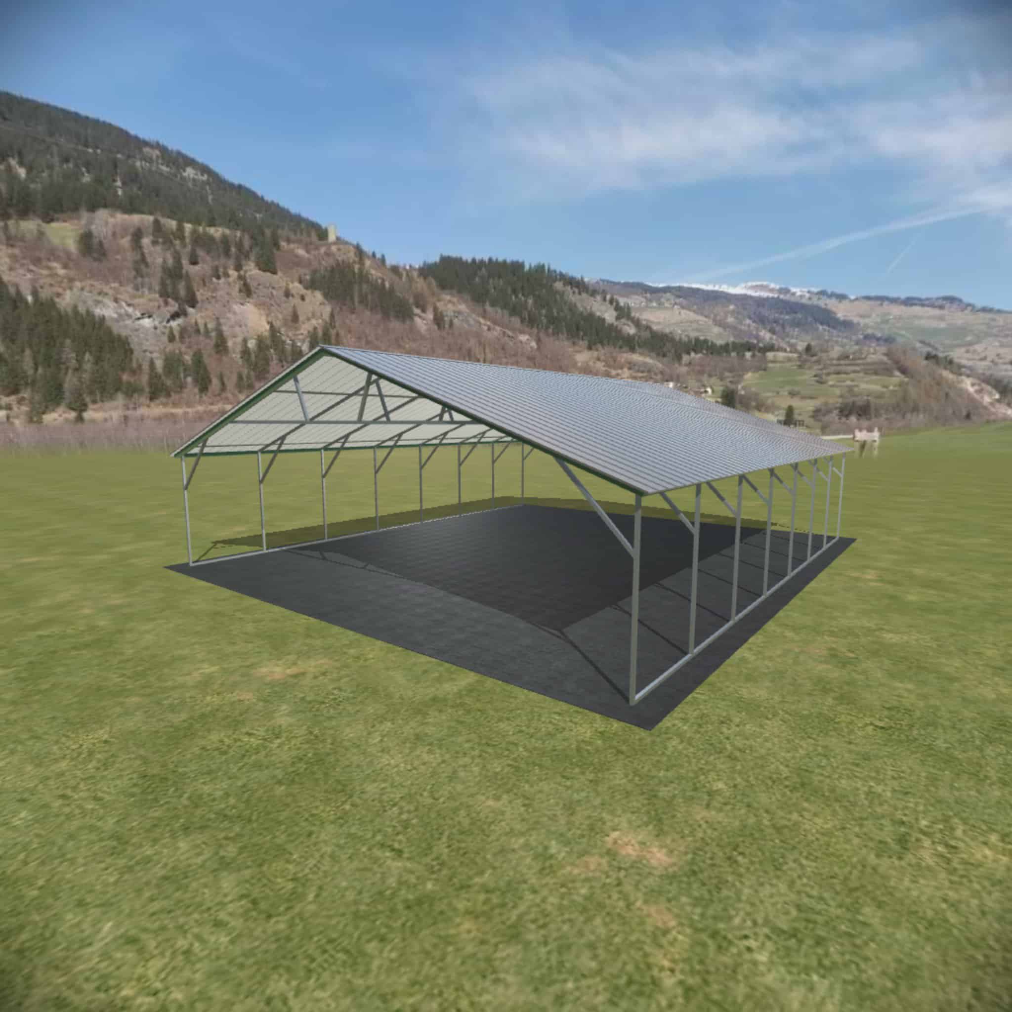 This vertical steel carport is shown with options of panel on both sides and two gables.