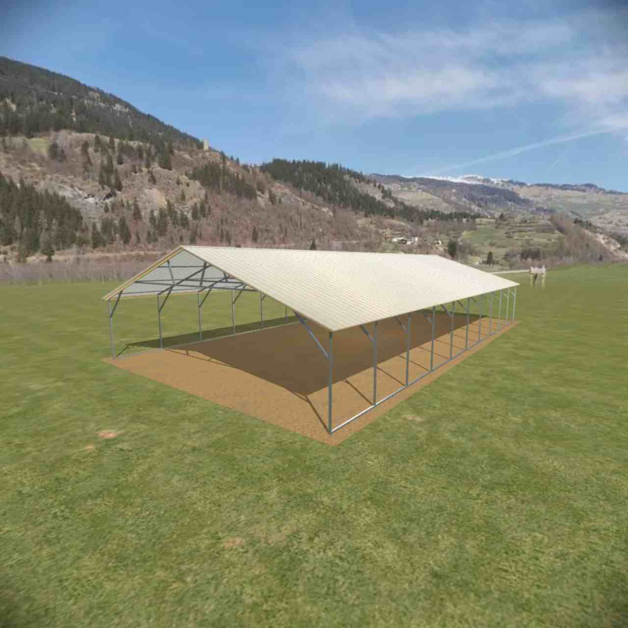 This vertical steel carport is shown with options of panel on both sides and two gables.
