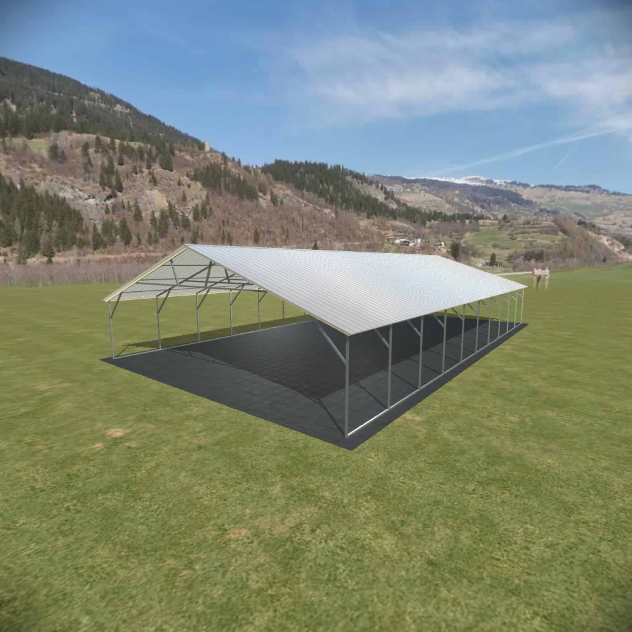 This vertical steel carport is shown with options of panel on both sides and two gables.