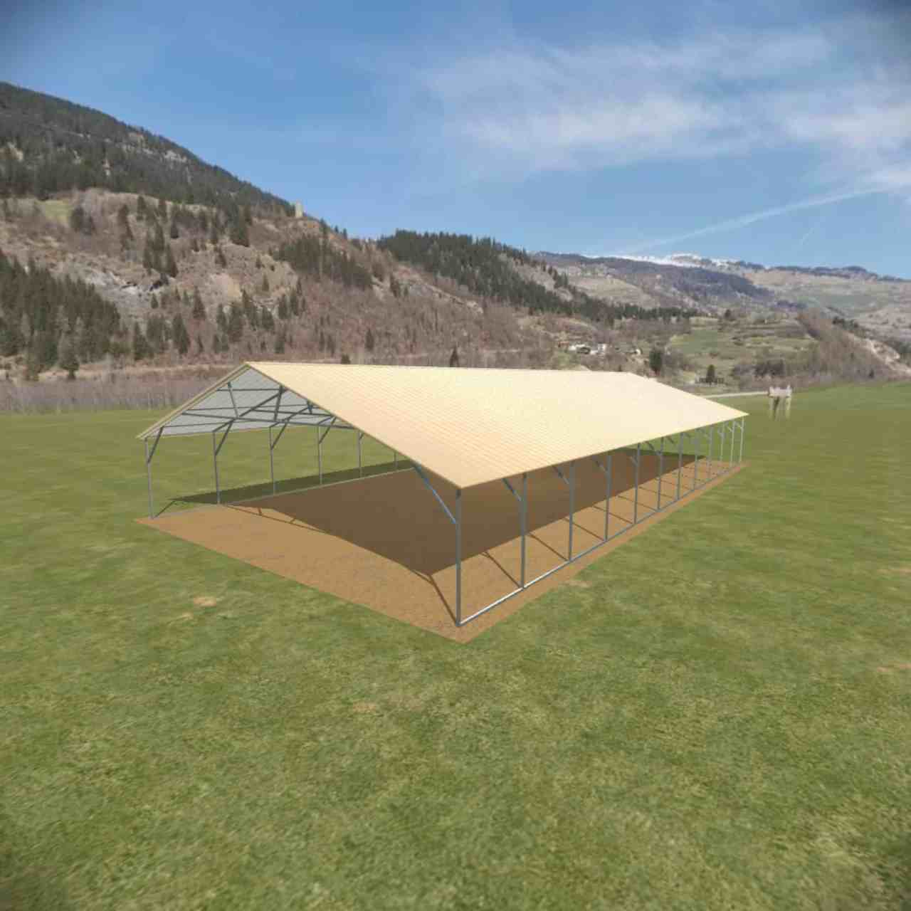 This vertical steel carport is shown with options of panel on both sides and two gables.