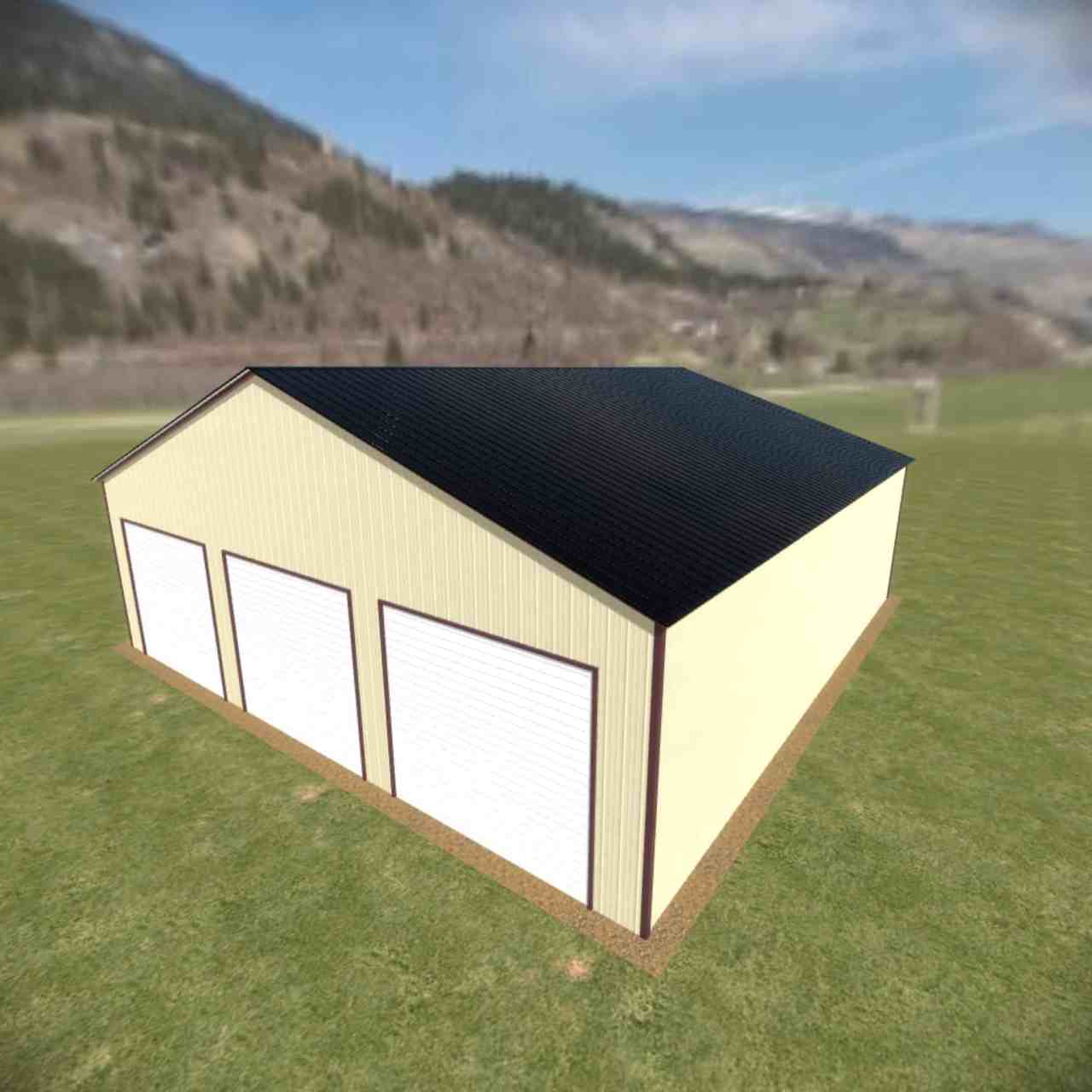 34 wide metal building with 16′ legs and 3 14×14 garage doors with optional deluxe two-tone.