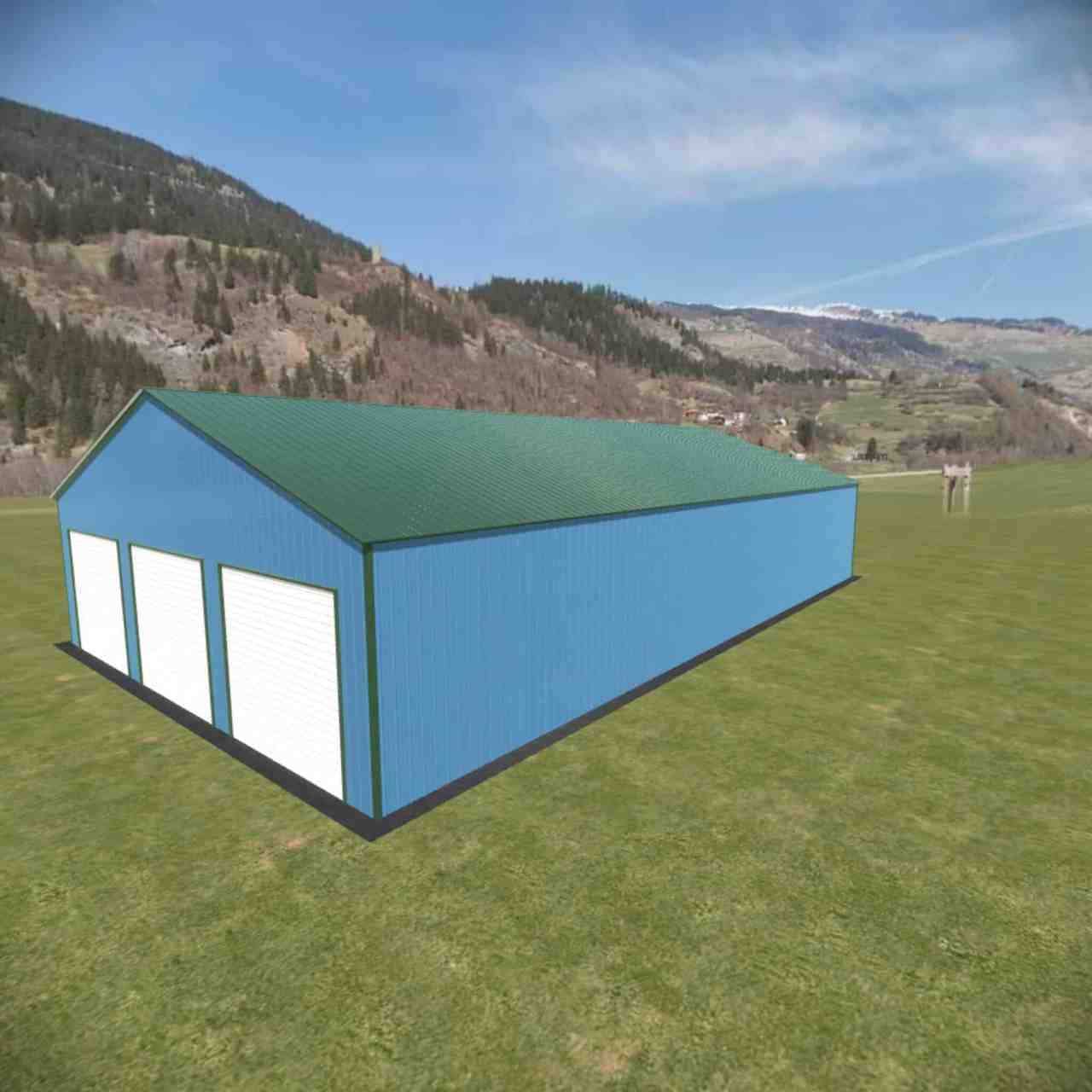 34 wide metal building with 16′ legs and 3 14×14 garage doors with optional deluxe two-tone.