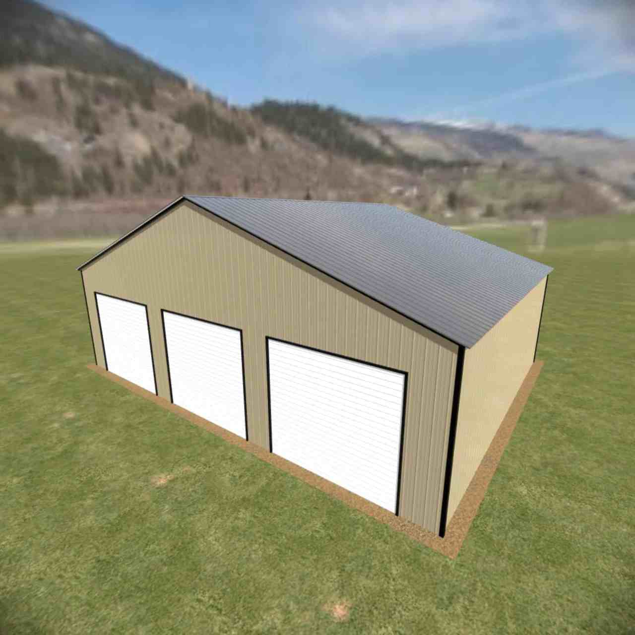 36 wide metal building with 16′ legs and 3 14×14 garage doors with optional deluxe two-tone.