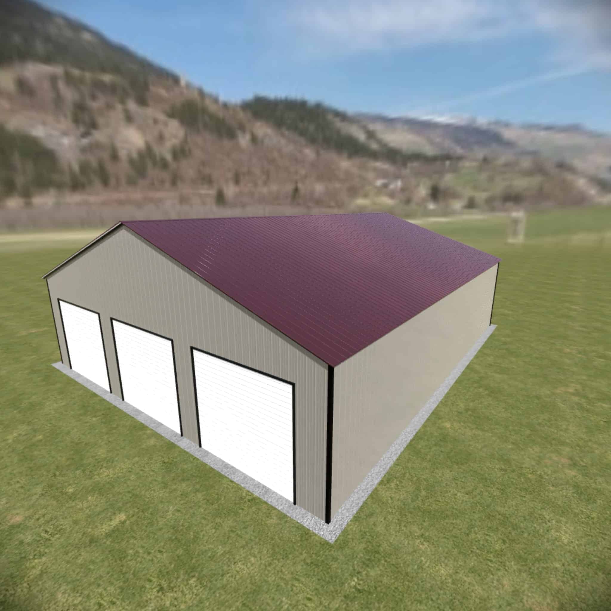 36 wide metal building with 16′ legs and 3 14×14 garage doors with optional deluxe two-tone.