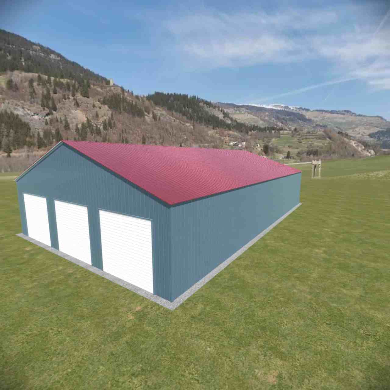36 wide metal building with 16′ legs and 3 14×14 garage doors with optional deluxe two-tone.