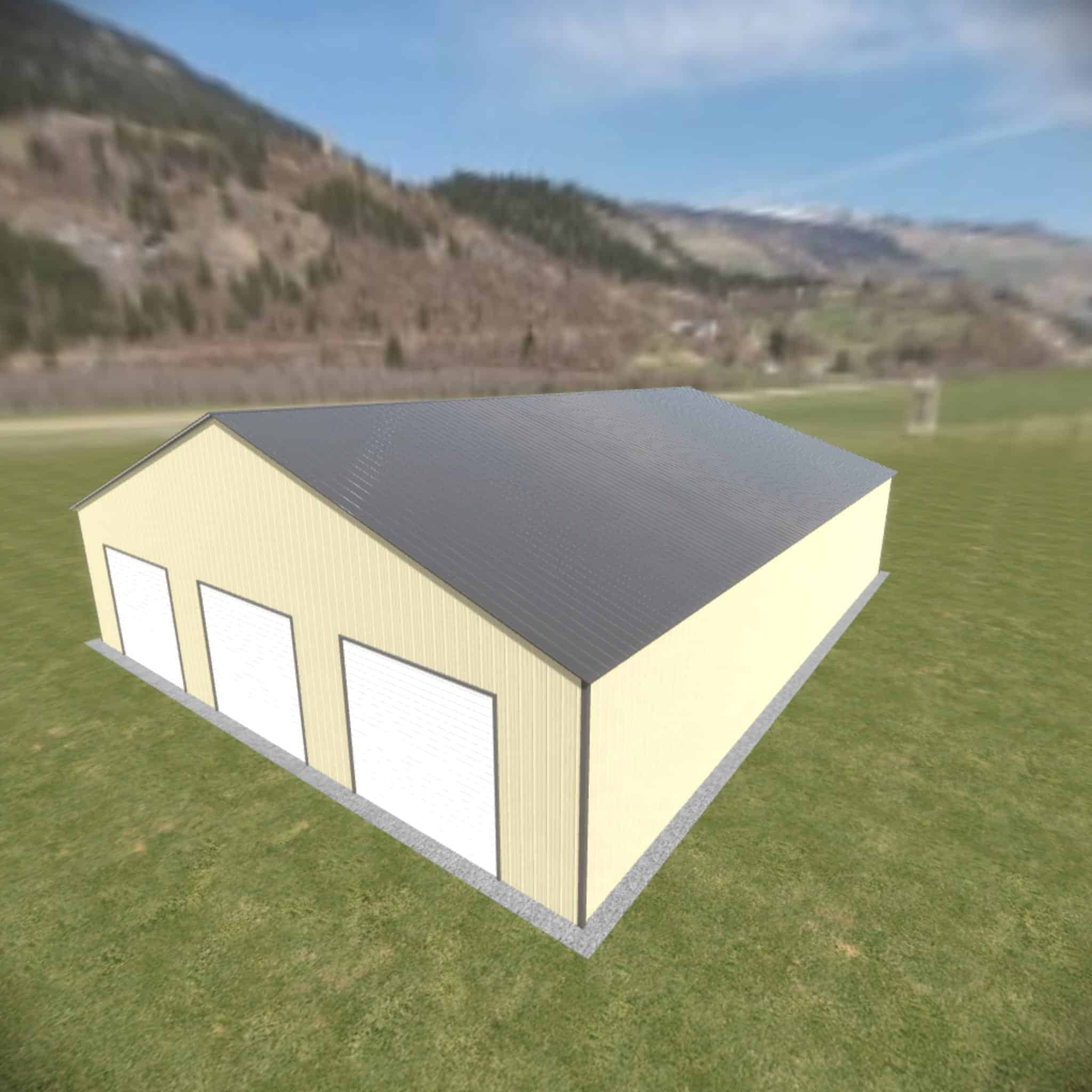 42 wide metal building with 16′ legs and 3 14×14 garage doors with optional deluxe two-tone.