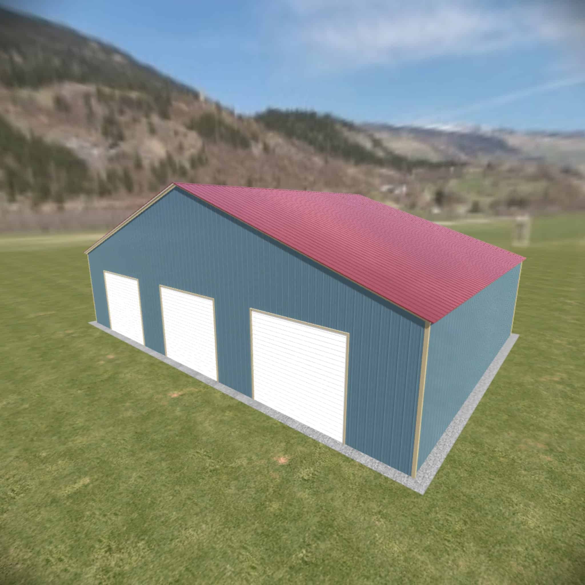 46 wide metal building with 16′ legs and 3 14×14 garage doors with optional deluxe two-tone.