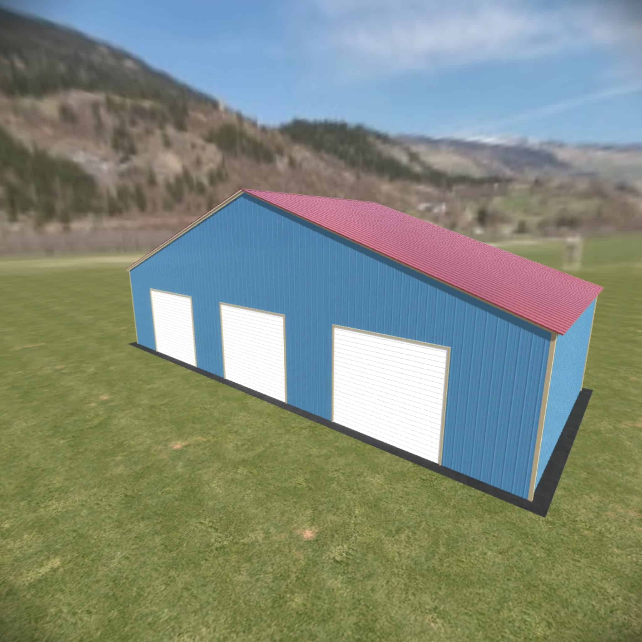 48 wide metal building with 16′ legs and 3 14×14 garage doors with optional deluxe two-tone.