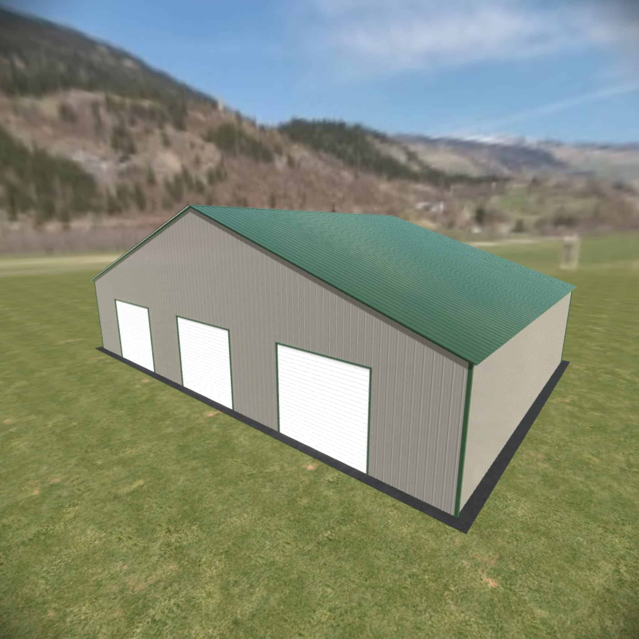 52 wide metal building with 16′ legs and 3 14×14 garage doors with optional deluxe two-tone.