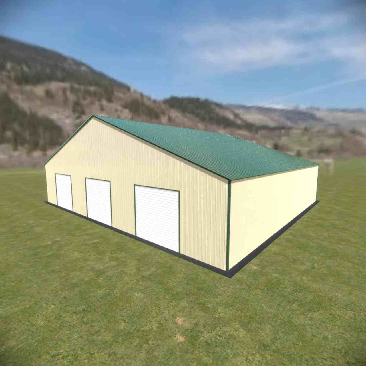 54 wide metal building with 16′ legs and 3 14×14 garage doors with optional deluxe two-tone.
