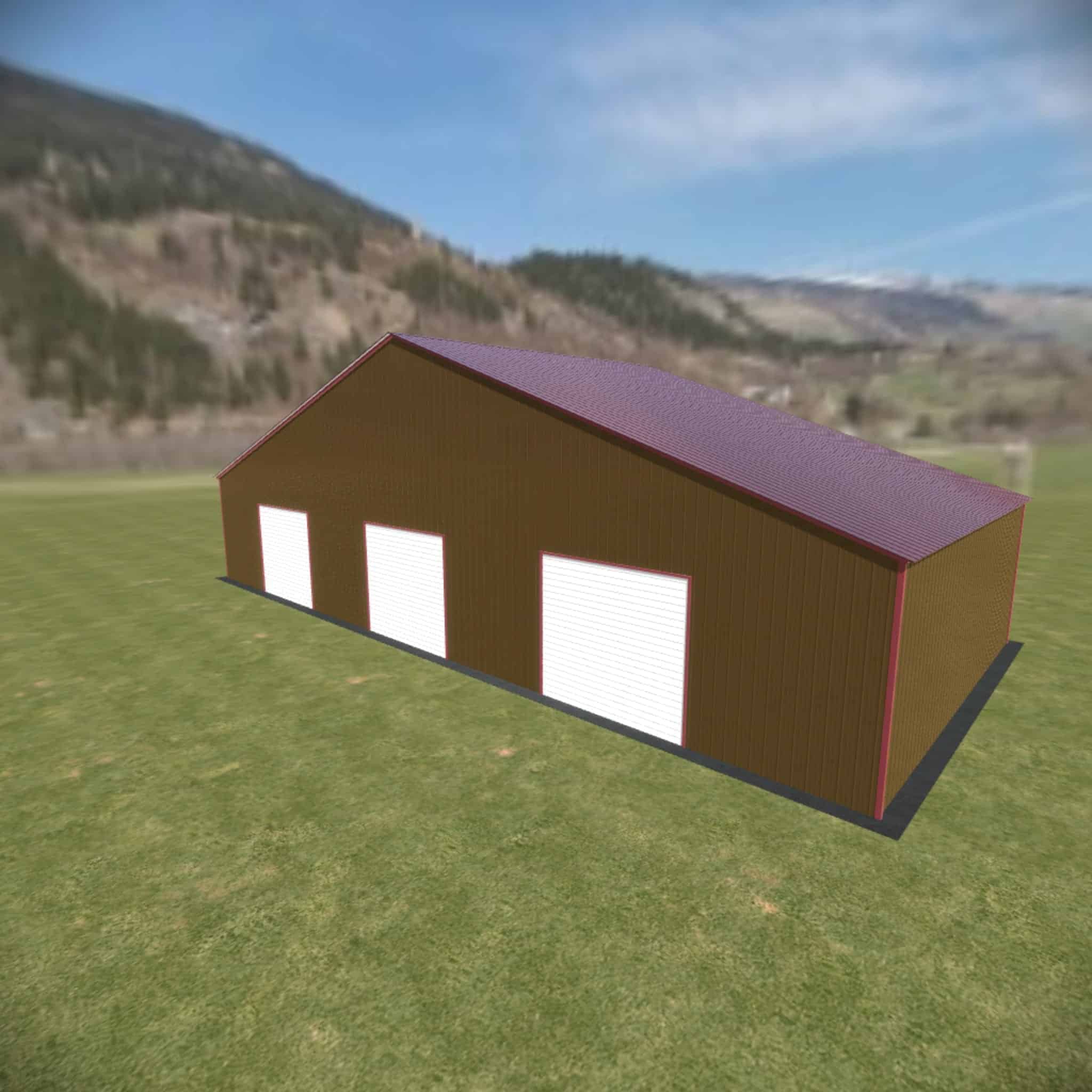 60 wide metal building with 16′ legs and 3 14×14 garage doors with optional deluxe two-tone.