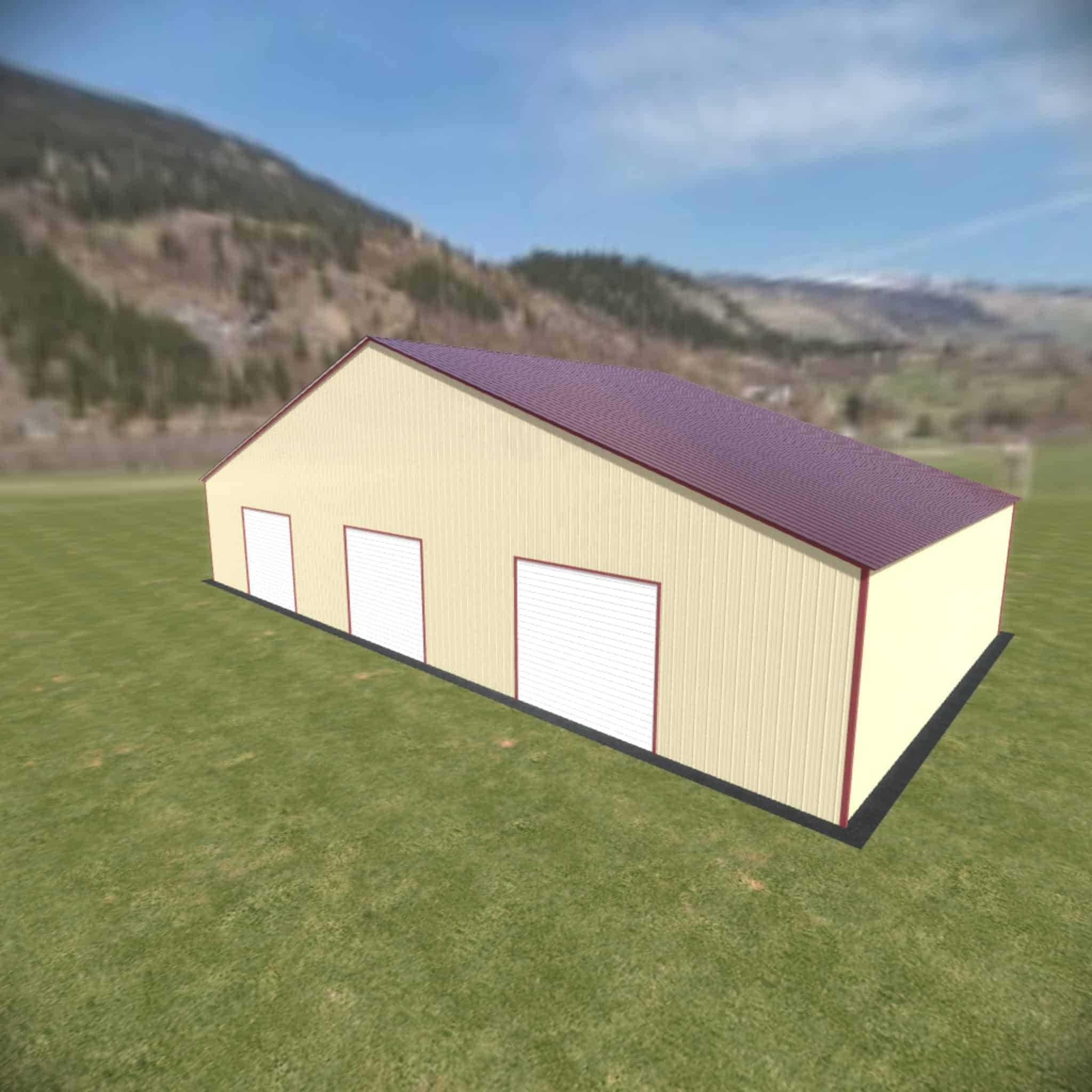 60 wide metal building with 16′ legs and 3 14×14 garage doors with optional deluxe two-tone.