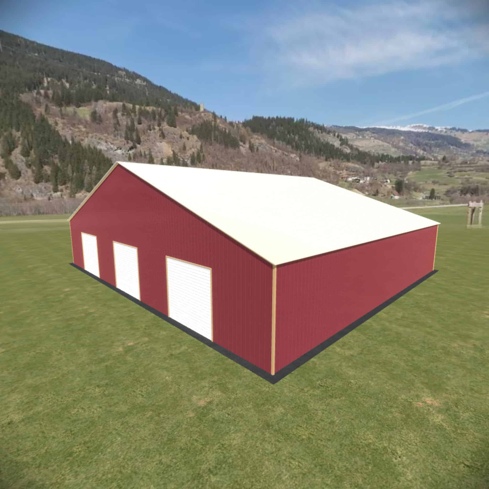 60 wide metal building with 16′ legs and 3 14×14 garage doors with optional deluxe two-tone.